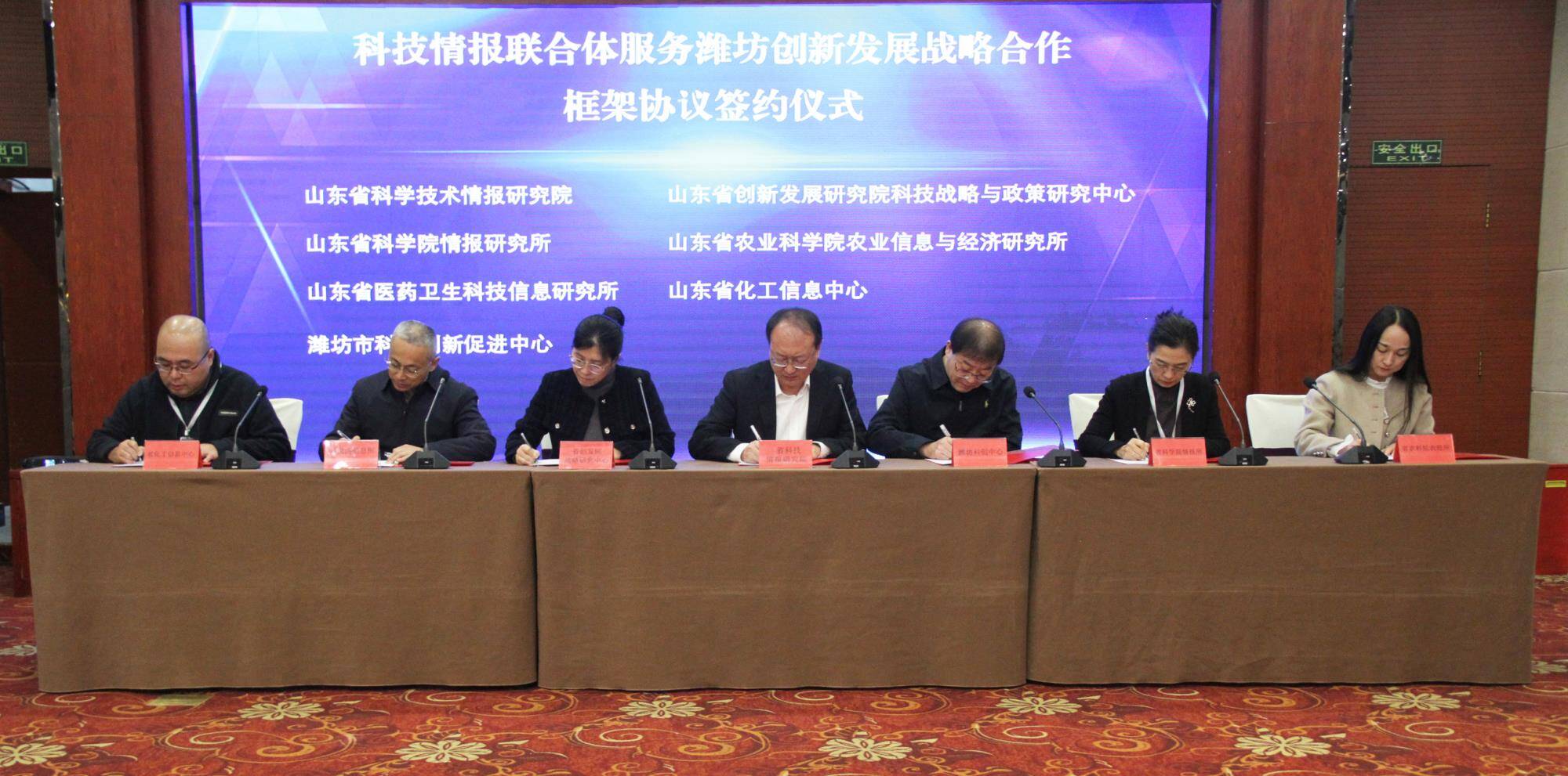 会议开幕式上,省情报院党委书记、院长杨书平,潍坊市科技局副局长、潍坊市科创中心主任侯建出席会议并致辞,随后举行科技情报联合体服务潍坊创新发展战略合作签约仪式,党总支书记杜江山代表信息所与省情报院、省创新发展研究院战略中心、省科学院情报所、省农科院信息所、省化工信息中心和潍坊市科创中心签署战略合作框架协议。