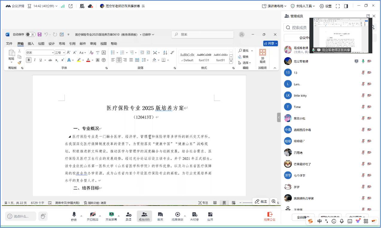 本次说明会由医疗保险专业培养方案牵头人范立军老师和预防医学(医疗保障方向)专业培养方案牵头人吴敏老师主讲,两位老师从选课角度,对培养方案的课程设计思路和整体安排进行了介绍,并着重对师生座谈会中反映集中的专业限选课程进行了逐一说明和解释。学院医疗保险专业是2021年开始招生的“四新”专业之一,根据软科中国大学最新专业排名,该专业评估层次为B+,且整体排名位于全国前20%。该专业基于医学与管理学的深度融合与创新发展,强调医学、经济学、管理学和保险学等多学科的交叉融合。而学院预防医学(医疗保障方向)是2024年根据校(院)专业建设部署的新上专业,该专业培养兼具疾病预防、健康管理和医疗保障政策分析能力的复合型人才。因此该专业培养方案在涵盖基础医学、临床医学、预防医学等主干课程,强化管理学、医疗保障学等特色课程,构建“预防+保障”双轮驱动的知识体系。两专业均高度强调学科交叉和学生的综合素质培养,因此同学们对于专业培养方案及选修课程也极为关注。