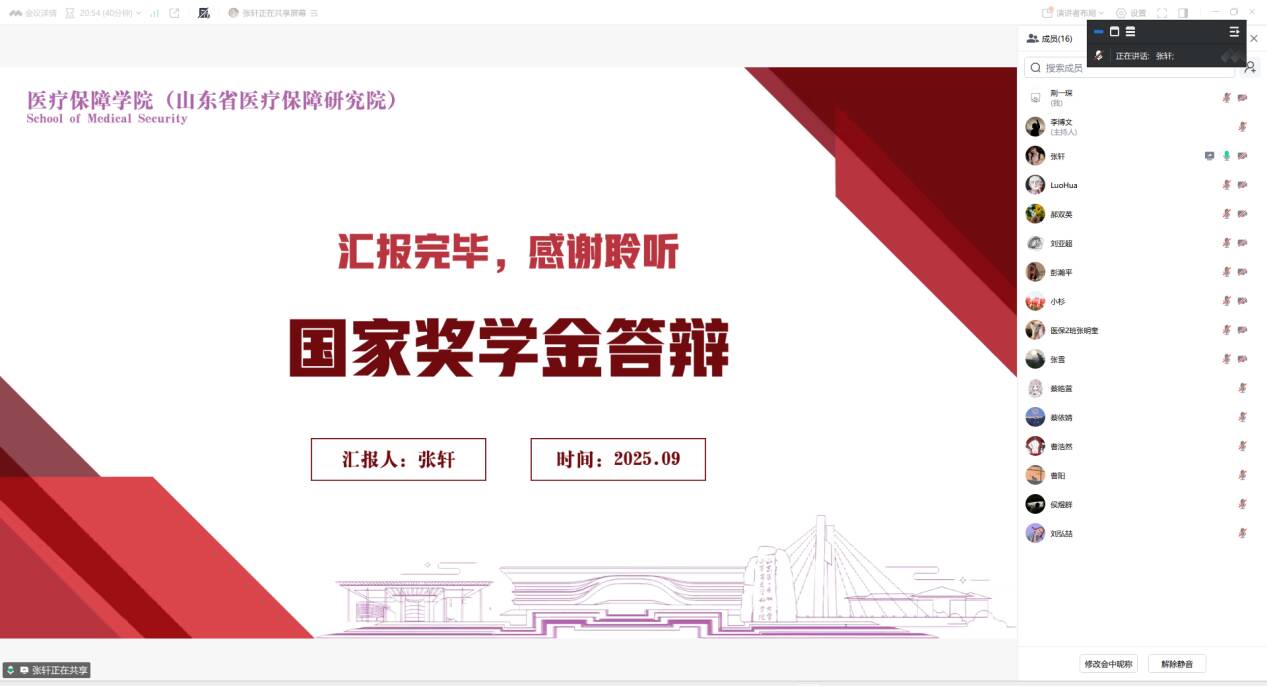 根据《山东第一医科大学关于做好2024-2025学年本科生国家奖学金评选工作的通知》要求,医疗保障学院于2025年9月23日以线上形式召开本科生国家奖学金答辩评审活动。本次评审旨在通过选拔优秀典型,发挥国家奖学金的榜样引领作用,进一步强化学风建设,营造发奋图强的育人氛围。学院评审委员会参加本次答辩。