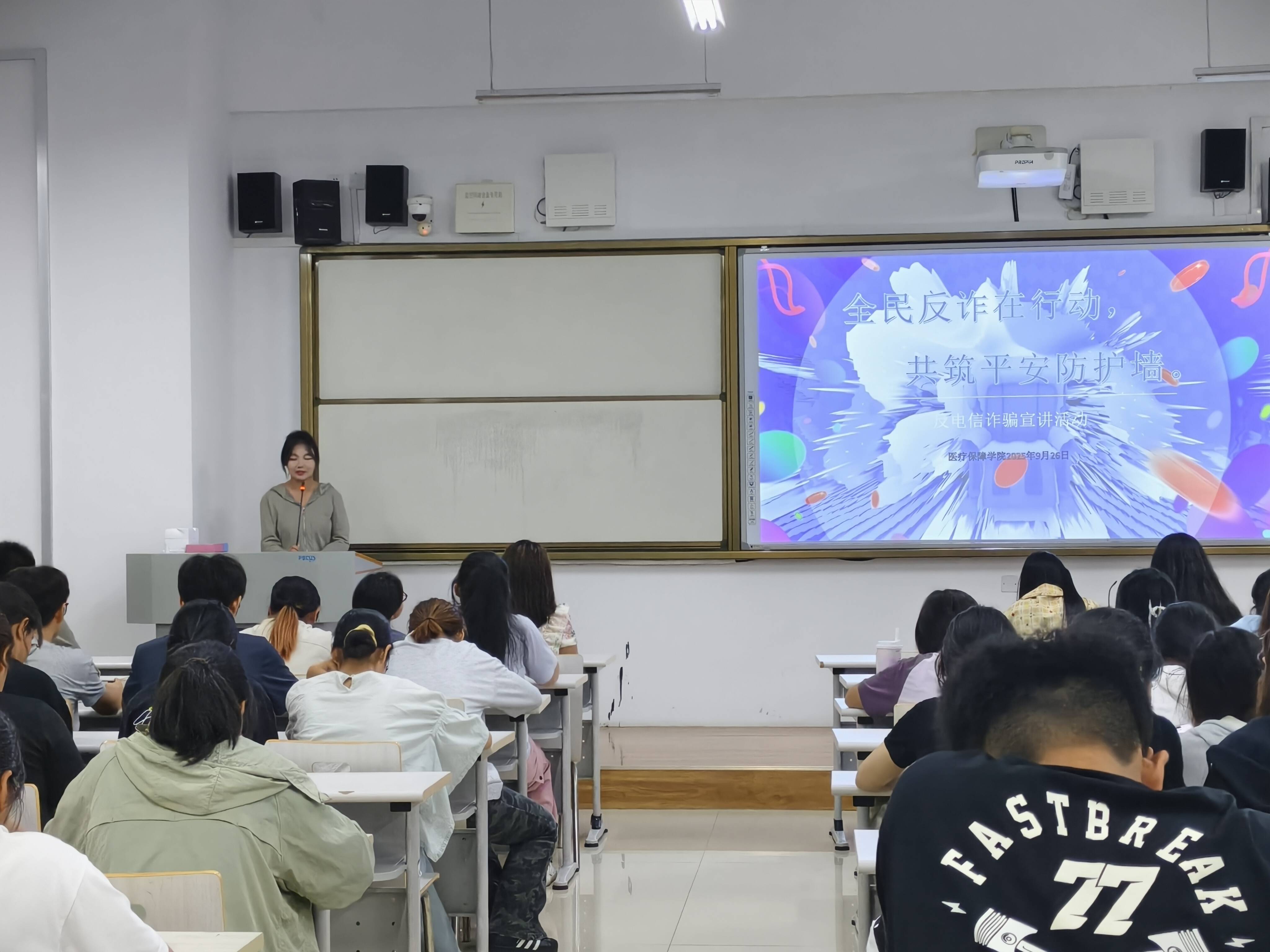 为切实提升学院学生防范电信网络诈骗的意识和能力,守护学生财产安全与校园和谐稳定,医疗保障学院于2025年9月26日在公教楼A1-302开展“全民反诈在行动,共筑平安防护墙”反电信诈骗宣传会,25级全体学生齐聚现场共同学习反诈知识。