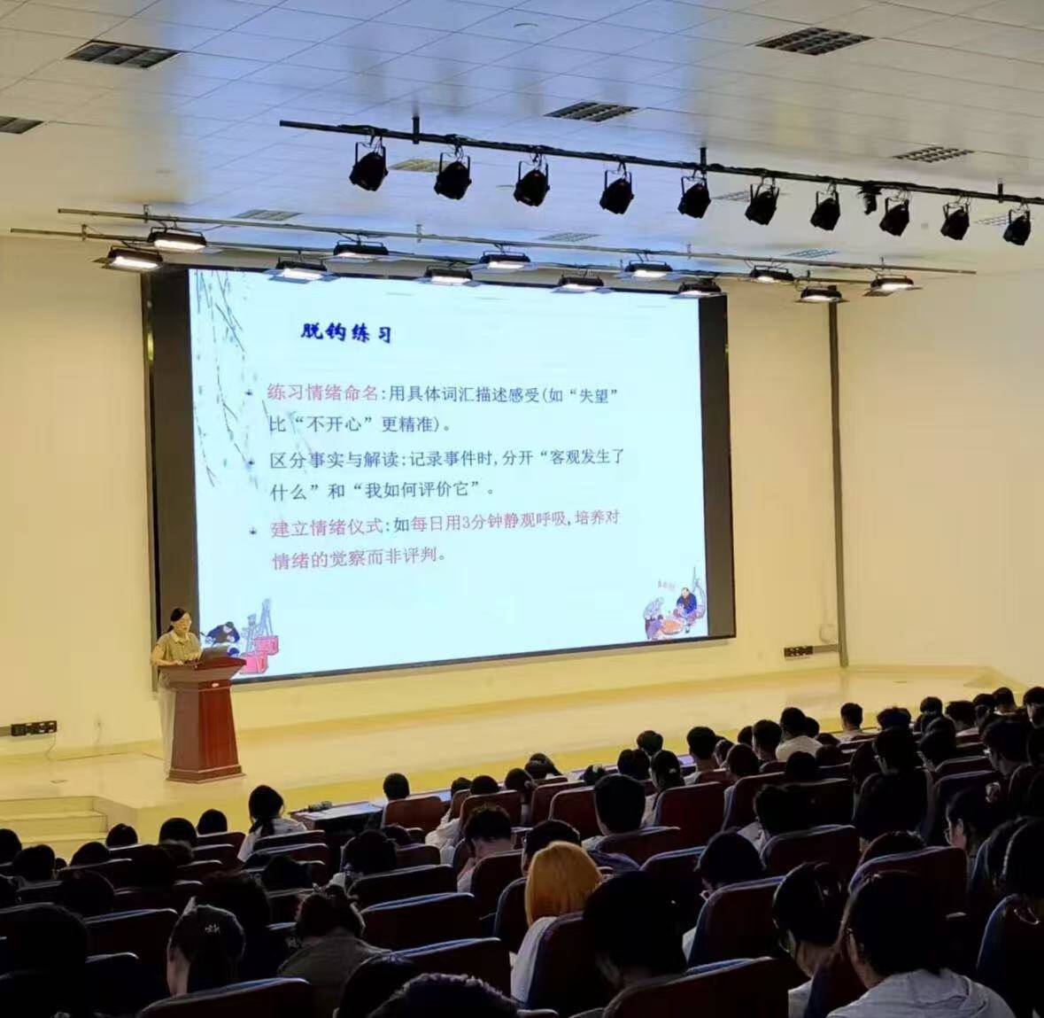 此次讲座由校(院)学工部、大学生心理健康教育中心赵艳霞主讲,讲座中,她从环境适应、人际关系、学业压力、情绪管理等新生常见的心理困扰切入,通过生动案例,深入浅出地讲解了心理健康的重要性,传授了识别心理信号、缓解焦虑情绪、建立良好人际联结的实用方法。同时,她还详细介绍了学校心理健康中心的服务内容、咨询方式及求助渠道,鼓励新生在遇到困惑时主动寻求专业帮助。