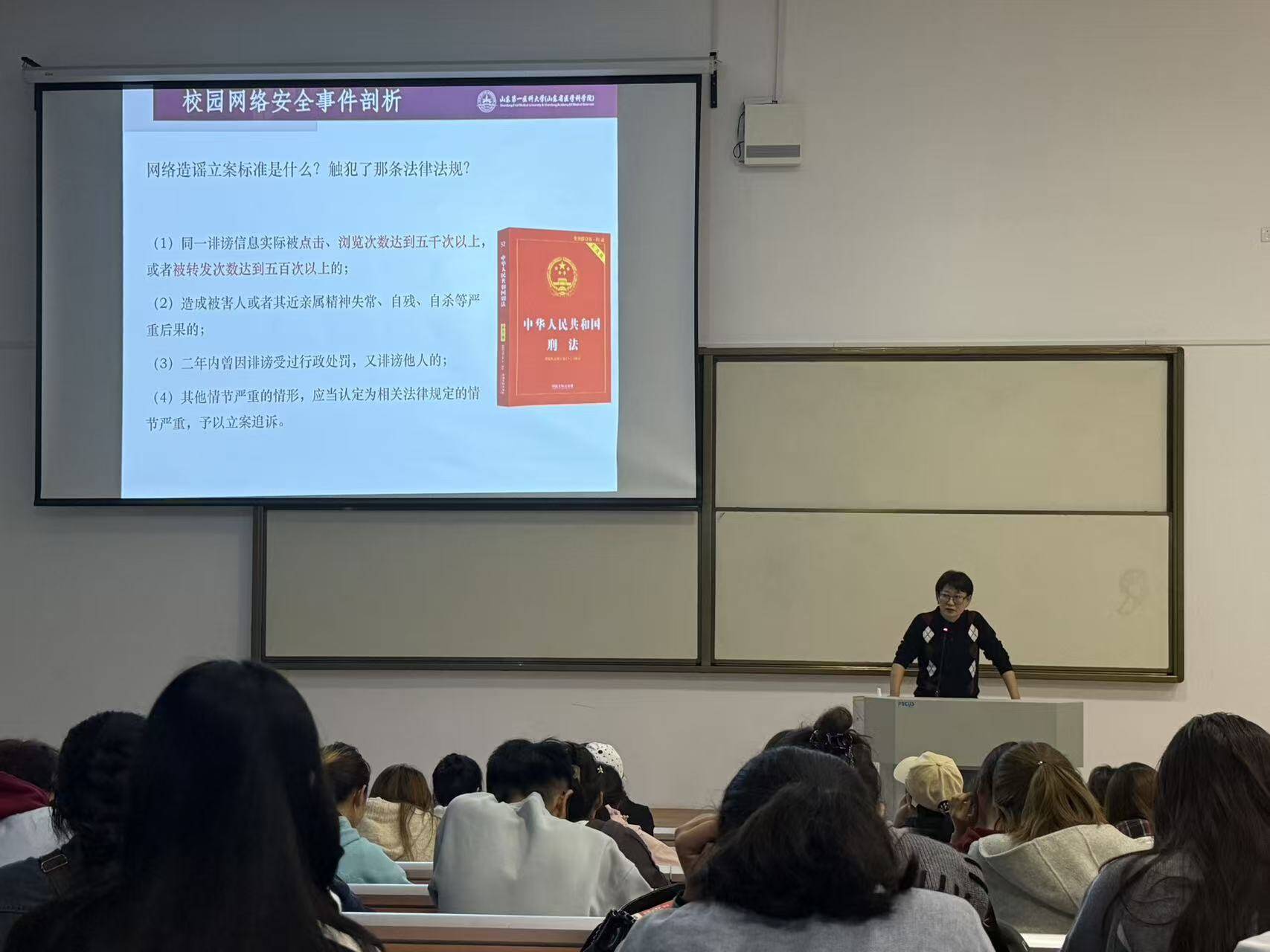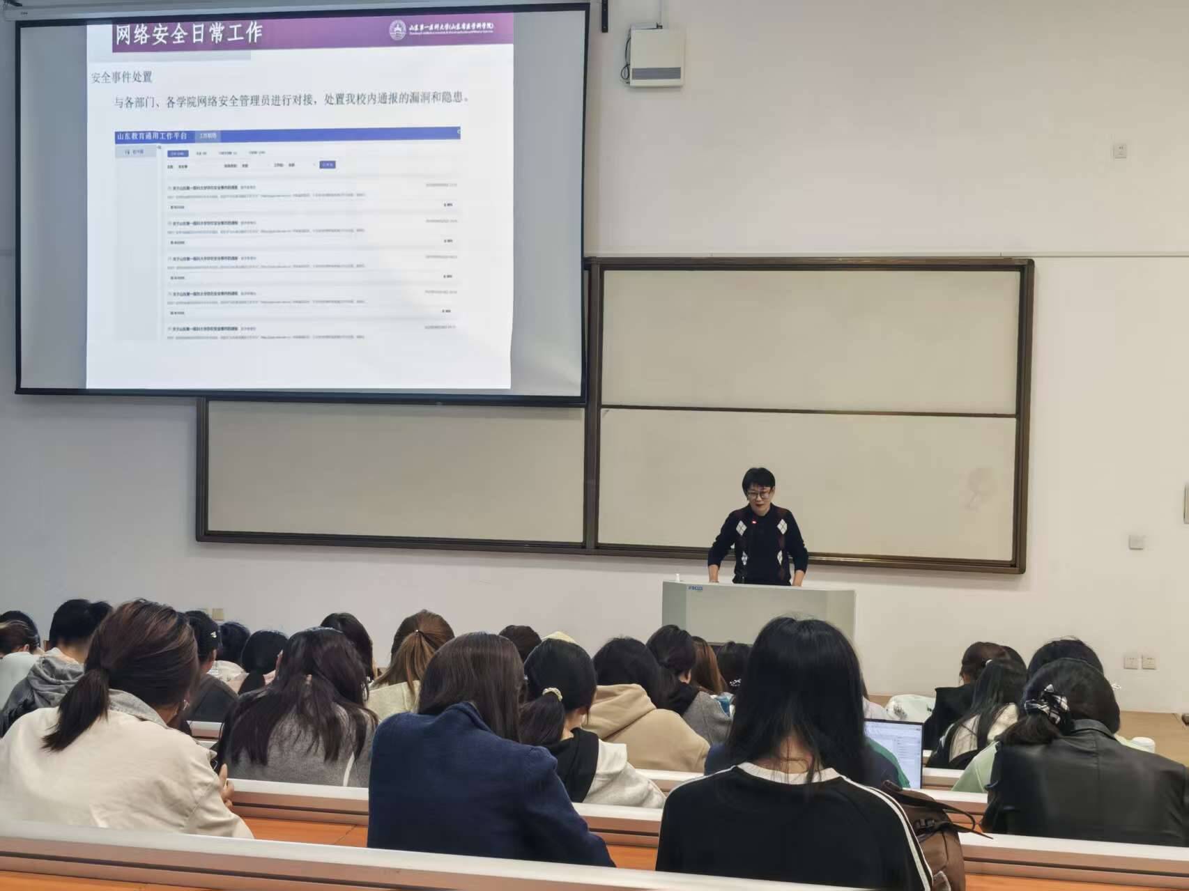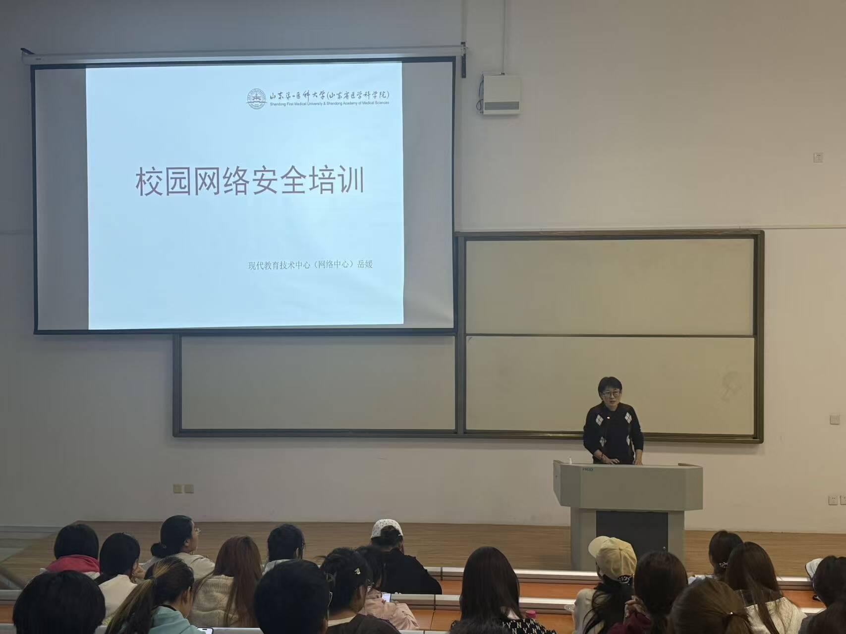 为切实提高学院学生网络安全意识及防范能力,共同构建和谐,健康,文明的网络环境,医疗保障学院于2025年10月17日在公教楼A1-109开展校园网络安全培训讲座,此次活动由现代教育技术中心岳媛主讲,学生们共聚现场学习网络安全知识。