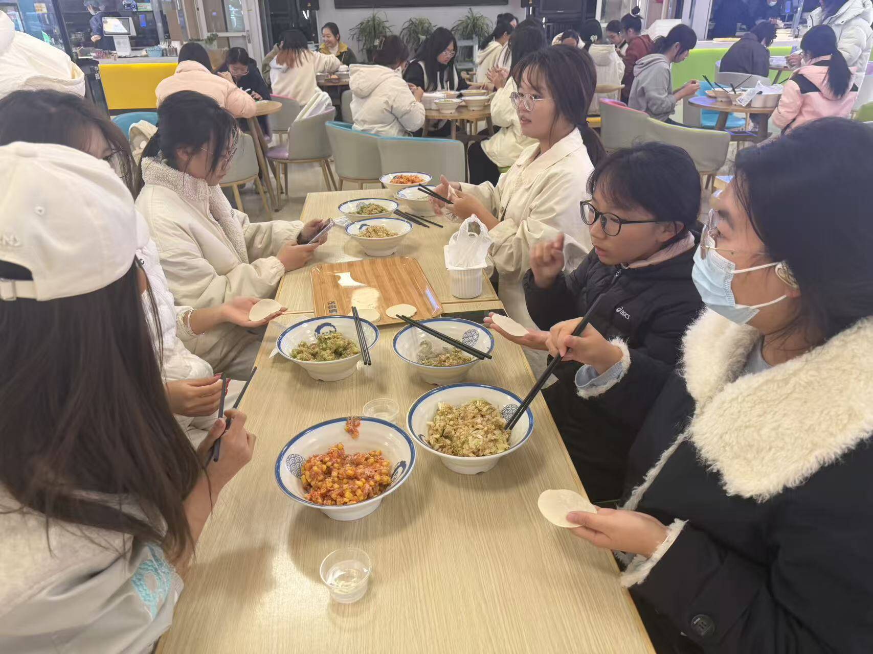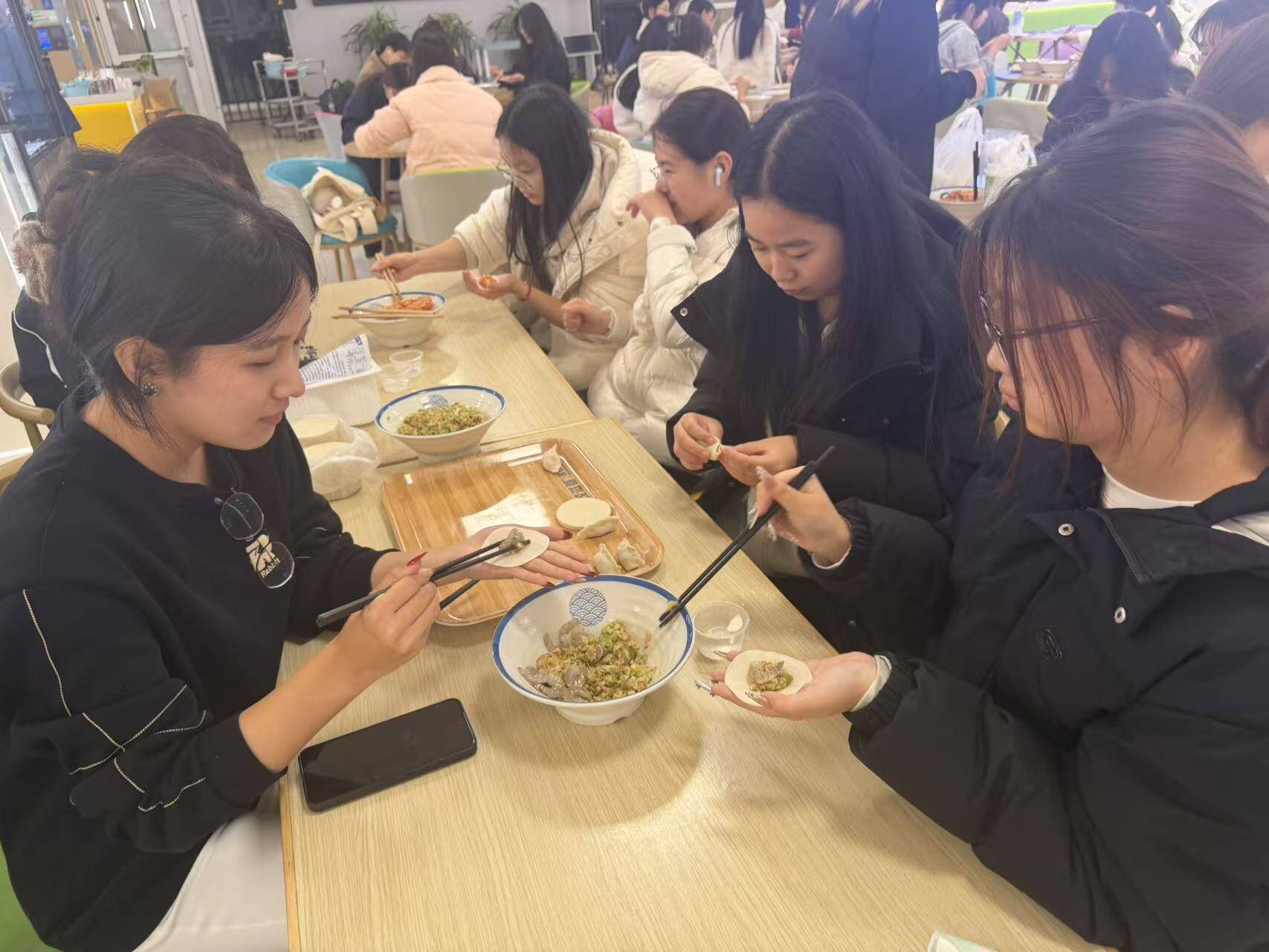 饺子制作完成后,食堂统一进行烹煮。用餐时段,同学们共同品尝劳动成果,交流实践体会。本次活动通过集体劳动与共同用餐的形式,增强了学生的团队意识和协作能力,也让同学们在集体活动中感受到学院的关怀与温暖。