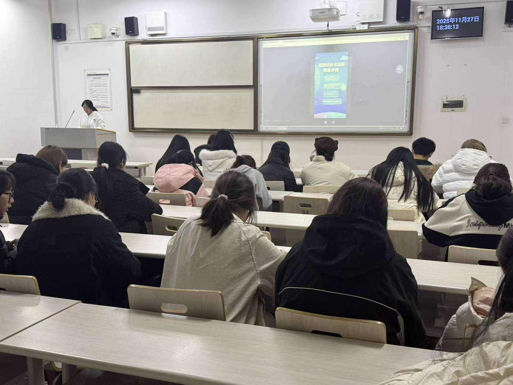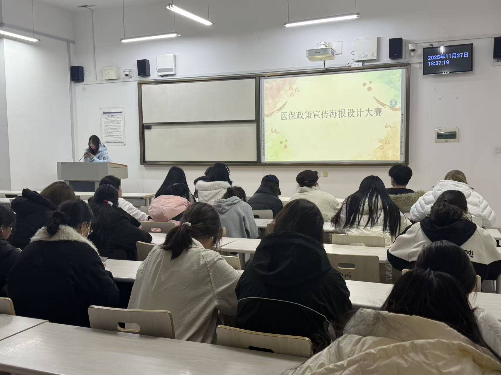 活动中,吕雨晴与朱思雯两位同学分别上台,结合她们精心设计的海报进行讲述,为同学们带来了一场关于医保政策的知识盛宴。