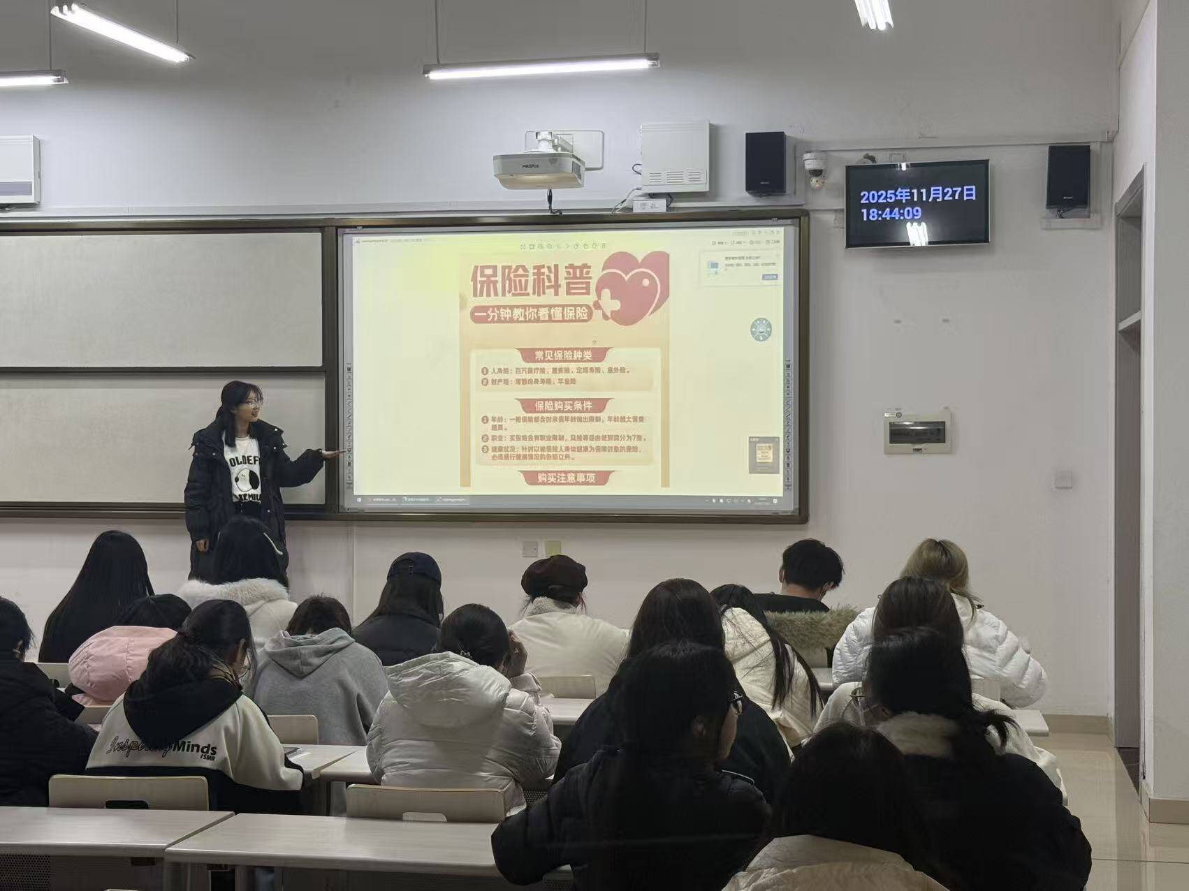 朱思雯则着重进行医保科普,详细介绍了购买保险的相关知识及注意事项。她提醒同学们要根据自身实际情况合理选择医保类型,了解保险条款,确保在就医时能够享受到应有的保障。