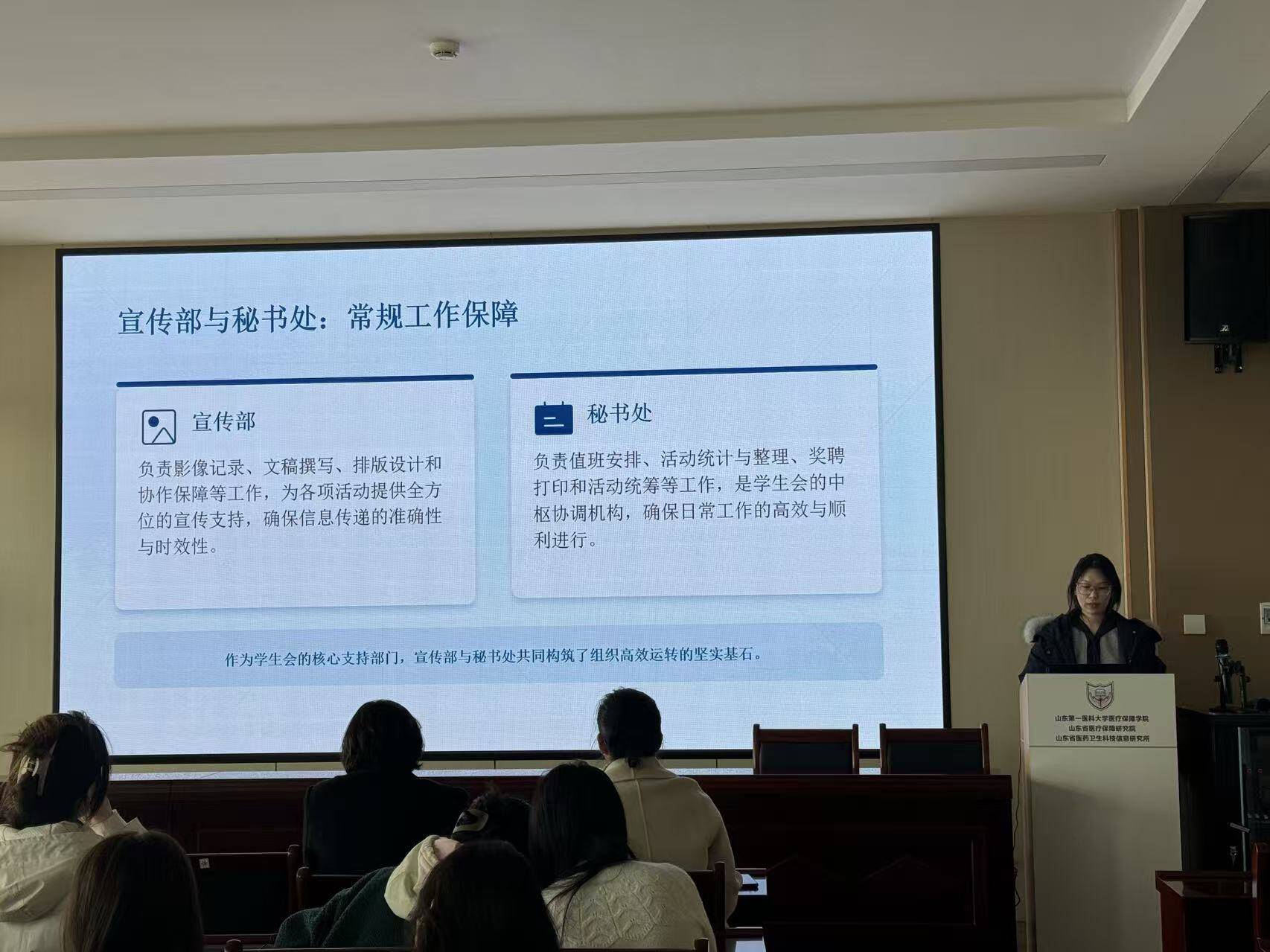 会上,学生会、青年志愿者协会、医疗保险社团负责人依次进行工作汇报,围绕思想引领、组织建设、活动开展、服务成效等方面系统回顾了过去一年的工作成果,并结合新学期发展目标,就重点工作计划进行专题汇报。各部部长立足部门职责,分享实践心得,交流工作经验,进一步明晰了未来工作的着力点与提升方向。